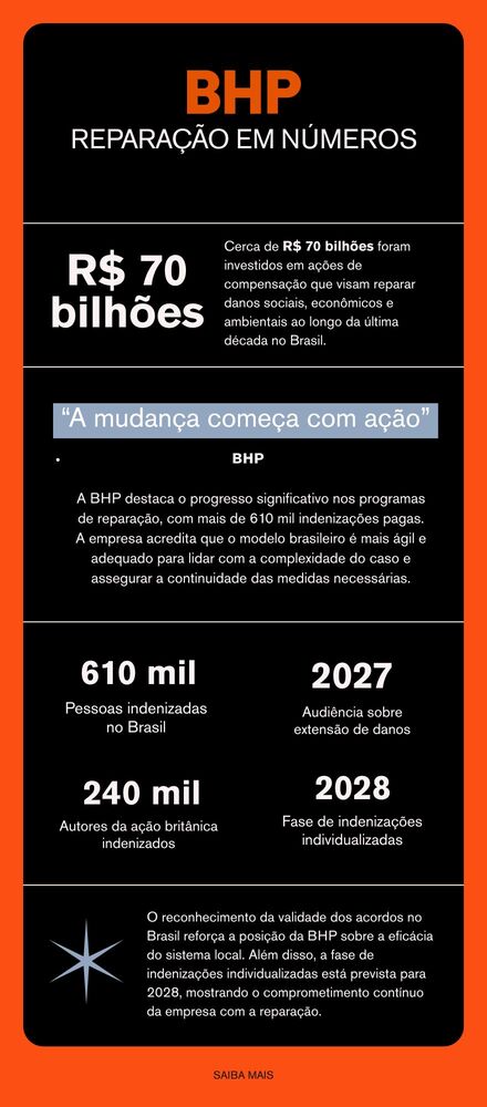 A decisão do Tribunal Superior de Londres envolvendo a BHP abriu uma nova fase na disputa judicial que ocorre no Reino Unido, mas a própria empresa avalia que a maior parte da reparação relacionada ao colapso da estrutura de Fundão já foi encaminhada no Brasil. Para a mineradora, os processos locais representam o instrumento mais eficiente para garantir que indenizações e compensações continuem chegando aos atingidos.